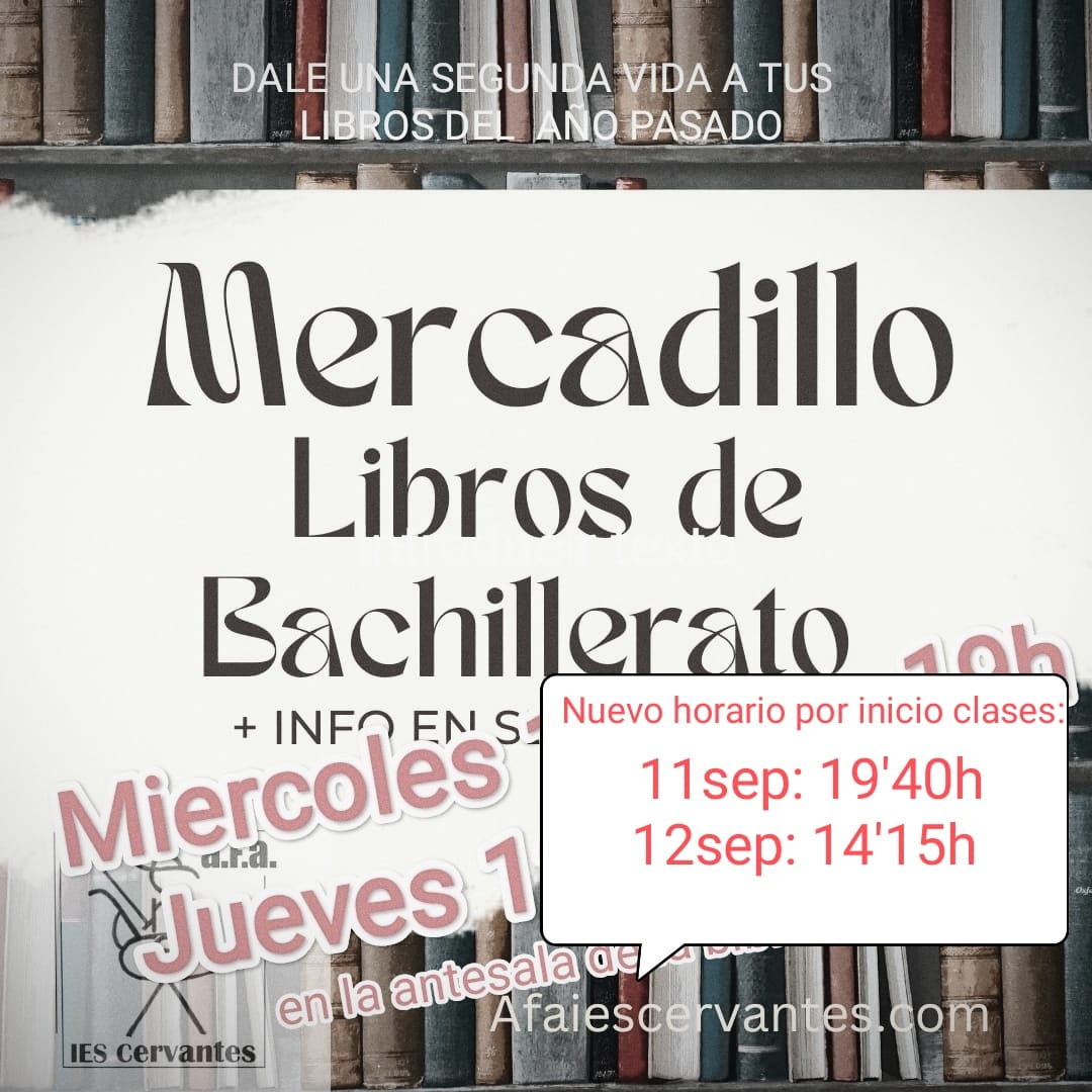 Debido al cambio de fechas de comienzo de curso que comunicó el centro y que podéis consultar aquí, hemos adaptado el horario del MERCADILLO DE LIBROS de Bachillerato.